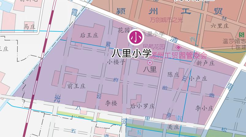 30.阜阳市颍州区清河街道办事处八里小学:东至南京路,北至三清路,西至七渔河,南至八里松路(八里社区)。