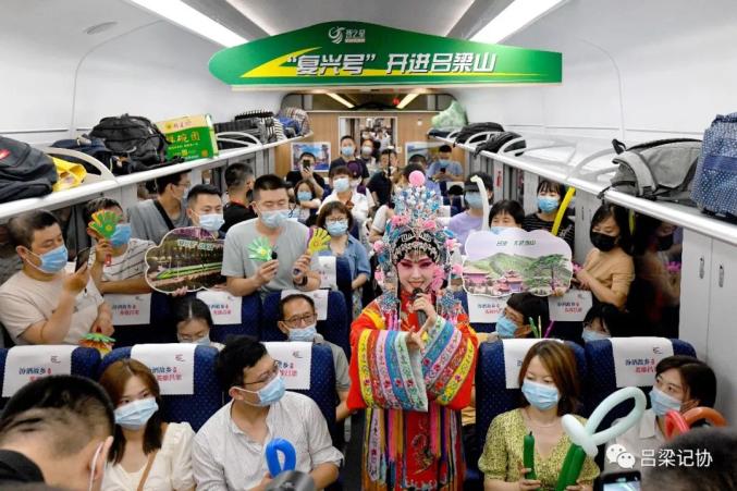 在吕梁开往太原南的首趟“复兴号”动车组列车上,乘务组为旅客安排的文艺演出正在进行。 刘亮亮摄2021年6月26日9时46分,D9232次“复兴号”动车组列车驶出吕梁火车站,驰向山西省会太原。从此,吕梁革命老区迎来动车时代,山西11个地级市实现动车开行全覆盖。