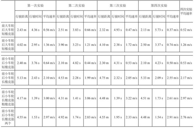表2 橡皮筋动力车使用不同部件行驶的测试结果