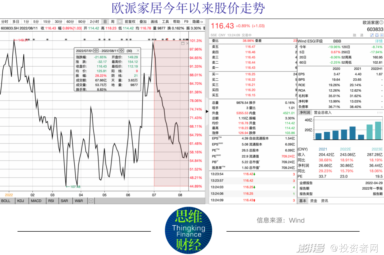 对于这次中期业绩不甚理想的情况,市场似乎早有预兆。近一个月,这家公司股价历了一轮大跌。据Wind统计,从今年7月1日到8月11日收盘,欧派家居股价跌幅近22%。