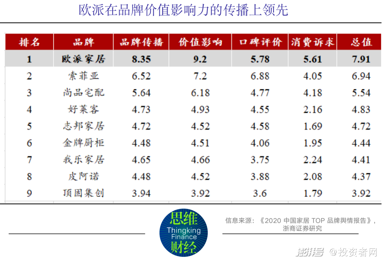 欧派利用广告营销不断巩固和提高了品牌影响力。根据新京报联合千龙智库发布的《2020 中国家居TOP 品牌舆情报告》显示,在品牌传播、价值影响、口碑评价、消费诉求以及总值五项维度上,欧派家居均遥遥领先于第二名尚品宅品。