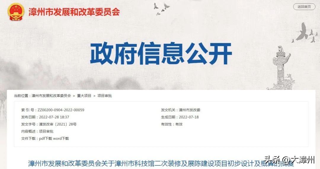 你单位《关于申请审批漳州市科技馆二次装修及展陈建设项目初步设计及概算的请示》及有关附件收悉。我委以漳发改审〔2020〕49号批复该项目可行性研究报告,漳州市政府投资项目评审中心就该项目概算形成《漳州市科技馆二次装修项目投资概算审查报告》(漳投概审〔2021〕143号)。经研究,原则同意该项目初步设计及概算。(项目代码:2020-350693-47-01-060399),具体批复如下: