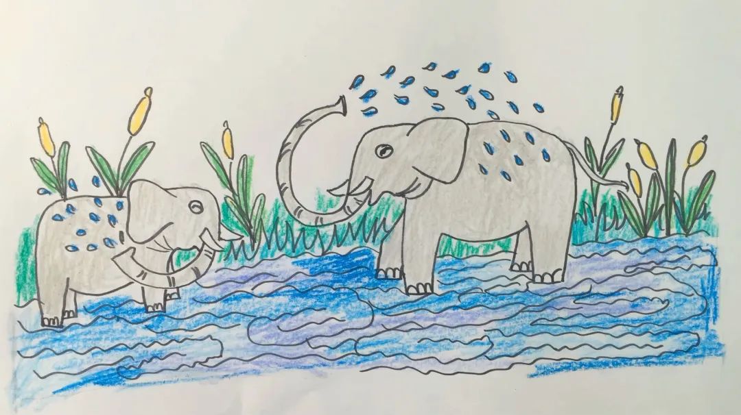 第七步:最后将芦苇草丛和水珠上色,如果觉得大象后面太空了可以多画几个芦苇~