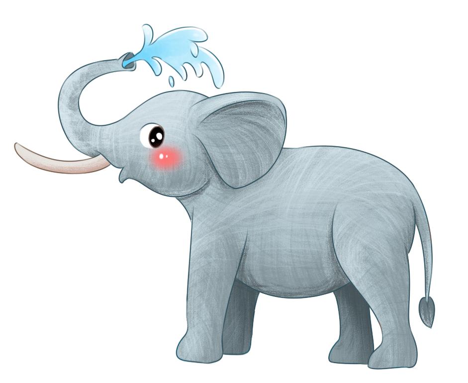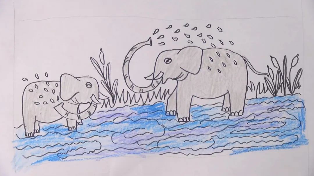 第六步:开始上色!给大象涂上灰色,注意象牙是白色不用涂色。可以用多种不同深浅的蓝色给水波上色会更丰富噢~