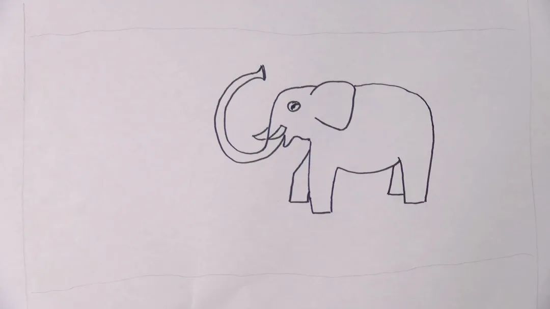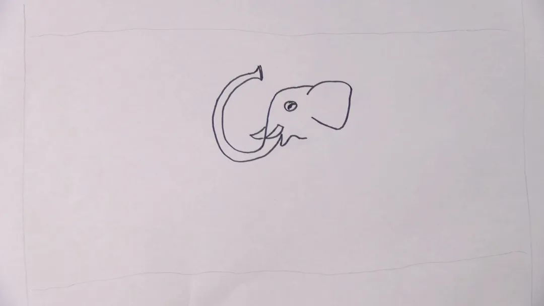 第一步:用黑色勾线笔在纸的中间偏上一点的位置画出大象的头部