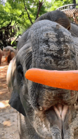 大象很能吃,它们吃草、树根、水果和树皮。它们用象牙把树皮从树上剥下来、把树根从地下挖出来。一只成年大象每天需要吃大约136公斤的食物,相当于两个成年人的重量!NO.7