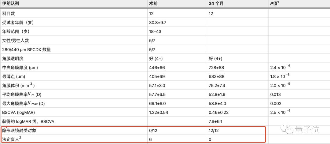 可以从表中看出,14名术前法定盲人在术后均未被判定为失明。而且两个队列中的所有受试者在术前均不耐受隐形眼镜,但在术后24个月时都可以耐受长时间佩戴隐形眼镜。