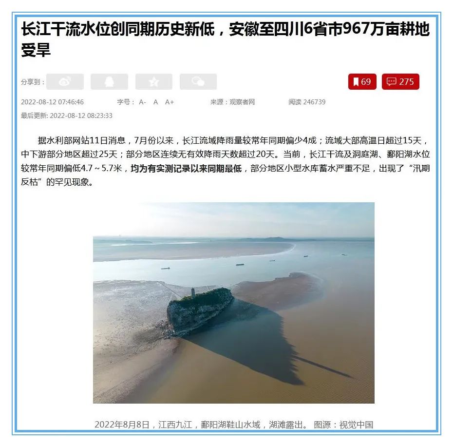 高温不止炙烤着城市丛林,也给生态环境带来了深刻的影响。在大多数人的印象里,暑期通常是长江流域的汛期,但今年八月中旬长江干流水位竟然降到了历史同期最低值,第一大湖鄱阳湖的水位更是下降了八米多。根据气象报道,未来一段时间超高温会继续笼罩江南,而且会扩大到江淮、中原地区。以至于有人惊呼说:“半个中国的温度都不适合人类生存了!”