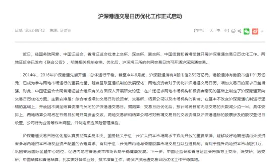 随着互联互通机制的发展深化,两地投资者对于优化沪深港通交易日历、增加交易日的需求日益增强。对此,中国证监会会同香港证监会组织有关方面深入开展研究论证,在广泛征求两地市场机构和投资者意见的基础上制定了沪深港通双向交易日历优化方案。