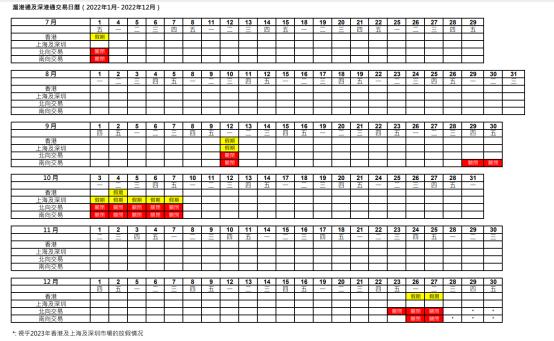 图为港交所官网所示的交易日历据财联社记者粗略计算,2022年上半年,共有15个交易日南北向通皆关闭,且有7个交易日南向单独关闭与2个交易日北向单独关闭。而2022年7至12月份,9个交易日南北向共同关闭,另有2日南向单独关闭,1日北向单独关闭。此外,因为涉及三地放假不同安排,12月28日至30日的交易暂时未能确定。如此看来,2022年至少有24个交易日南北向通同时关闭,12个交易日南向通或北向通单独关闭。若关闭交易日可减少一半,且南北向通有一方单独关闭按0.5日计算,将有约18个交易日在新制度下开放交易。