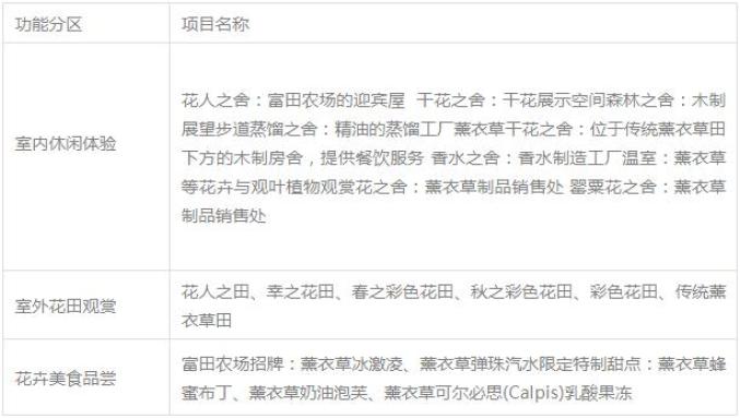 普罗旺斯旅游形象定位是薰衣草之乡,功能定位是农业观光旅游目的地。旅游核心项目及旅游产品是田园风光观光游、葡萄酒酒坊体验游、香水作坊体验游。在业态方面设置家庭旅馆、艺术中心、特色手工艺品商铺、香水香皂手工艺作坊、葡萄酒酿造作坊。