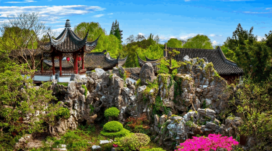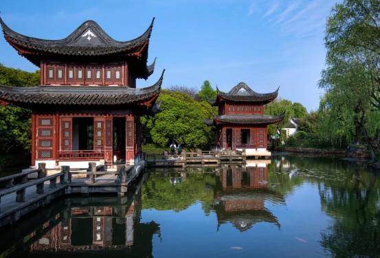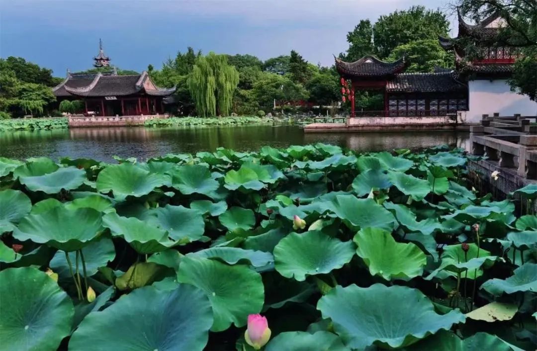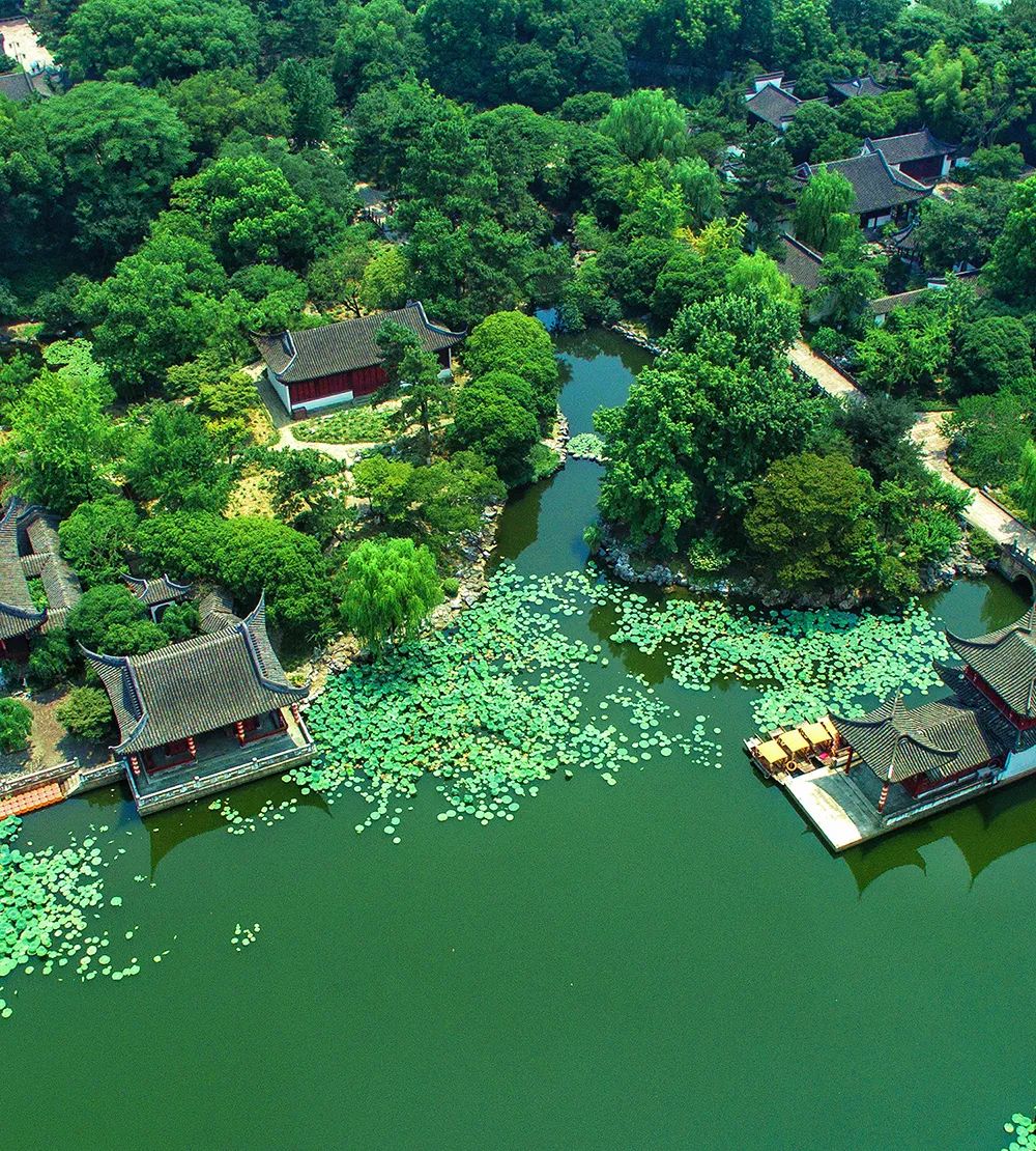 以江南古典园林为特色,兼具皇家园林、寺庙园林风情。盛夏时光,闲憩于园中水畔,草木柔软,流水潺潺,闲看小阶落花,坐望云卷云舒。
