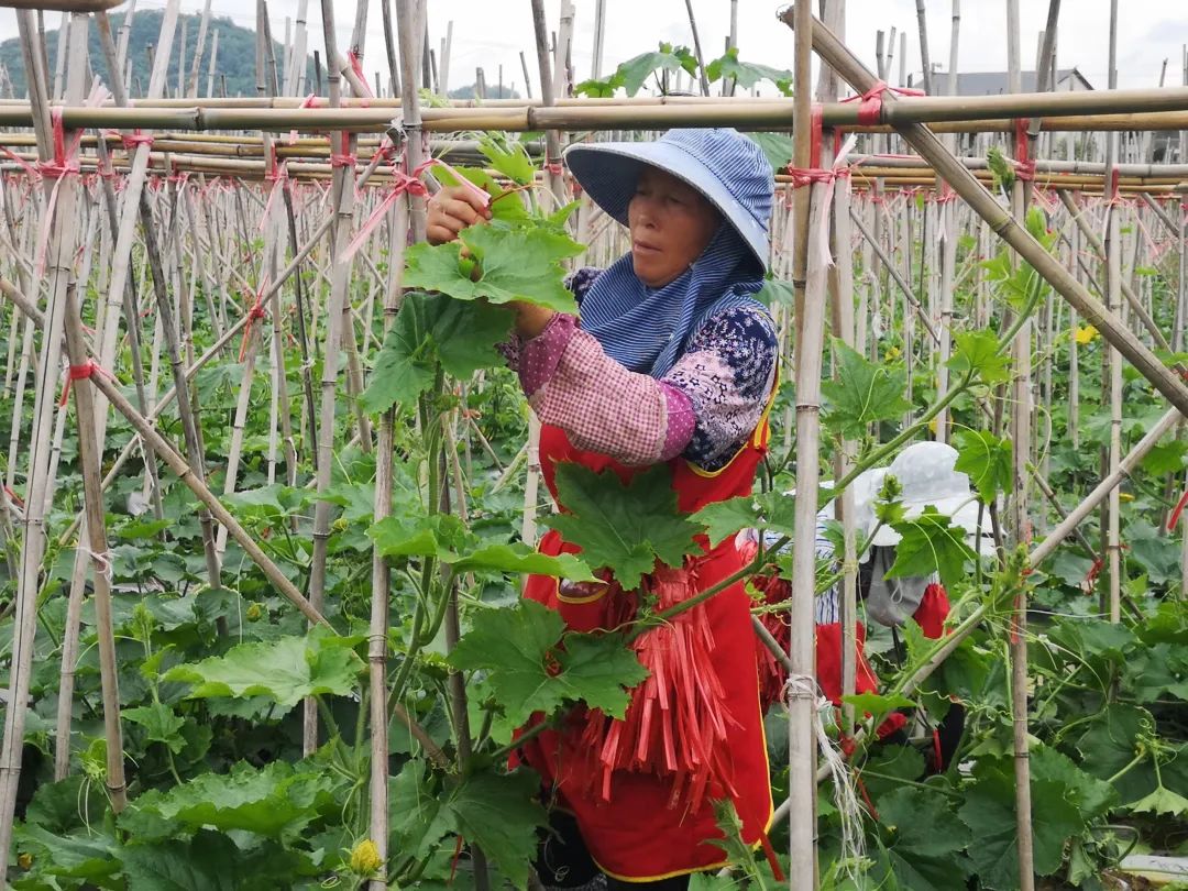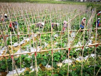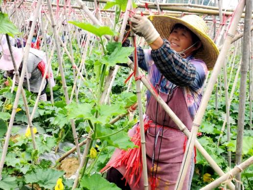 “我们年经大了,不能外出打工,在冬瓜基地绑瓜藤已经10多天了,一天100块钱的工资,这里挨家近,干下来划算。”天龙村村民陈先婵说。“移栽、采摘等用工高峰每天有100人左右,最多的时候可达300多人,都是周边的村民。一年下来发放人工工资将近500万元。”李富红说。