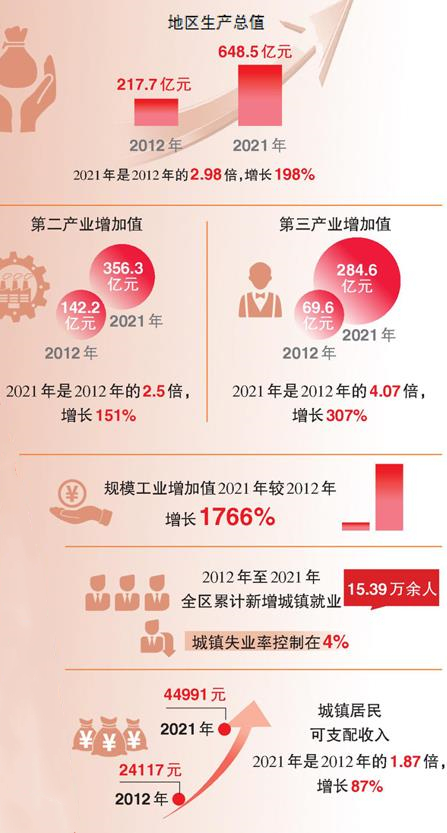 城乡就业持续扩大,居民收入显著提高。十年来,全区累计新增城镇就业15.39万余人,城镇登记失业率控制在4%以内。2012年,全区农村居民人均纯收入19915元,城镇居民人均可支配收入24117元;至2021年,全区居民人均可支配收入44716元,其中农村居民人均可支配收入39356元,城镇居民人均可支配收入44991元,城镇居民人均可支配收入增长达87%。