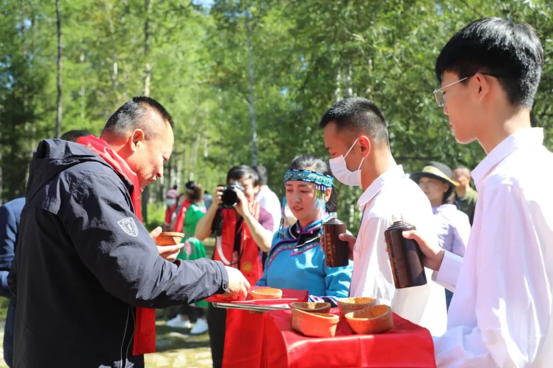 “来到萨满山,一生都平安!”身着鄂伦春民族服饰的姑娘们为来宾们戴上象征吉祥、幸福、平安美好寓意的“希瓦”红绸带,“请饮下马酒!”来宾们接过桦树皮酒碗,一饮而尽,同时也饮下了鄂伦春族人对远方来客的浓浓敬意。通往萨满山的七星栈道,沿途能看到兴安岭特有的兴安落叶松、樟子松、白桦树亭立山间。鸟虫鸣叫、草木茂盛,呼吸清新的空气、脚踏软嫩的青石苔,随着宾客的脚步,一幅美丽的生态画卷徐徐展开……
