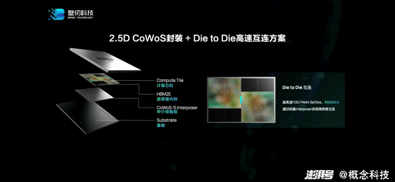 从壁仞科技联合创始人、CTO洪洲的介绍来看,BR100明确采用了台积电的2.5D CoWoS-S封装方案——两片die和周边HBM2e内存都放在一片硅中介(silicon interposer)上。我们在刚刚发布的《先进封装的现在和将来》一文中详细介绍过这种先进封装技术,国内厂商在用的应当还寥寥无几。