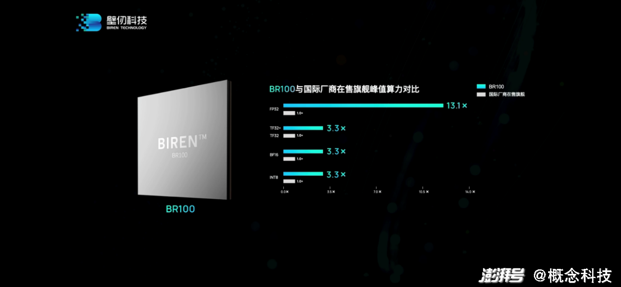 所以我们将注意力主要放在BR100身上。从一些关键数据就可以看出本次发布的BR100GPU是真正的“大”芯片。壁仞在宣传中提到“创下全球(通用GPU芯片的)算力记录”“单芯片算力达到PFLOPS级别”“峰值算力是国际厂商在售旗舰产品3倍以上”。