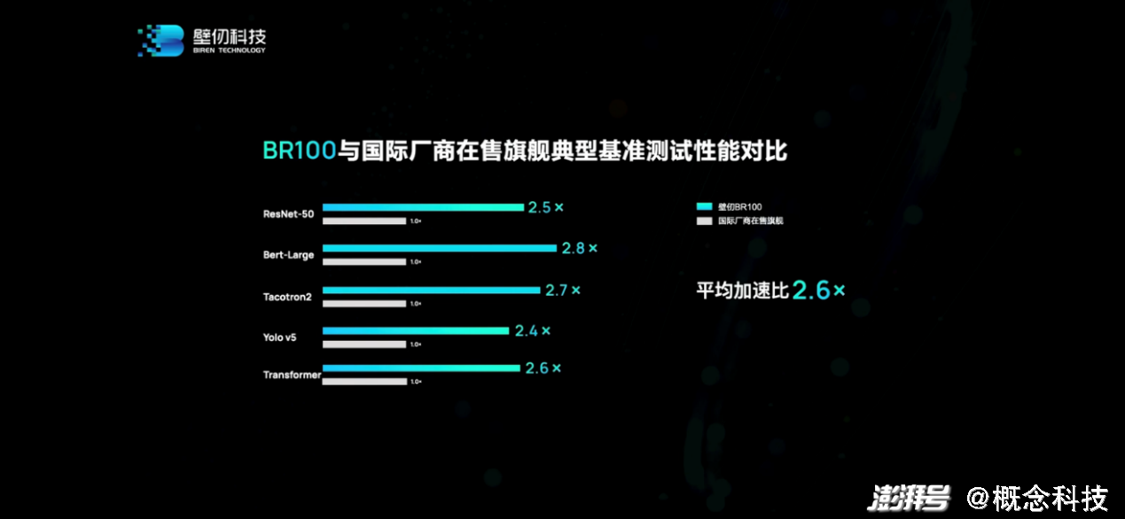 到更为真实的负载中,跑主流、具代表性的网络,包括CV、NLP,还有现在很流行的Transformer,壁仞BR100仍然是有不小的优势的,“平均加速比2.6x”。不过这种涉及到实际业务的对比,不仅是芯片本身,还要带上系统、软件的对比,应当进一步明确对比对象和内容。我们很期待未来看到壁仞BR100及对应系统参与MLPerf基准测试。