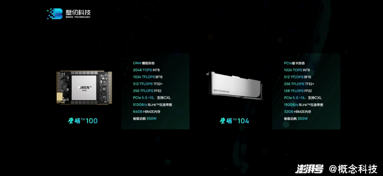 这次壁仞科技发布了两颗芯片:BR100和BR104。这两者的区别主要在于BR100是两片相同的die(或chiplet)封装到一起;BR104则只用了1片die,所以相关算力与IO等参数大多为前者的一半,适配不同的市场需求。