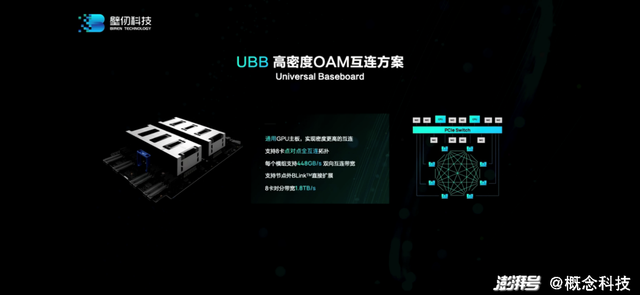 系统和性能扩展相关的部分,应该也是很多人关注的重点。“我们把8个OAM模组放在通用UBB主板上,形成8卡之间点对点的全互连拓扑。充分利用BR100上面的高速接口,和UBB的互连基础设施,8张卡之间两两互连。”徐凌杰说,“节点内每张卡能够有448GB/s的互连带宽,节点之外还有64GB的带宽。”8卡对分带宽1.8TB/s。