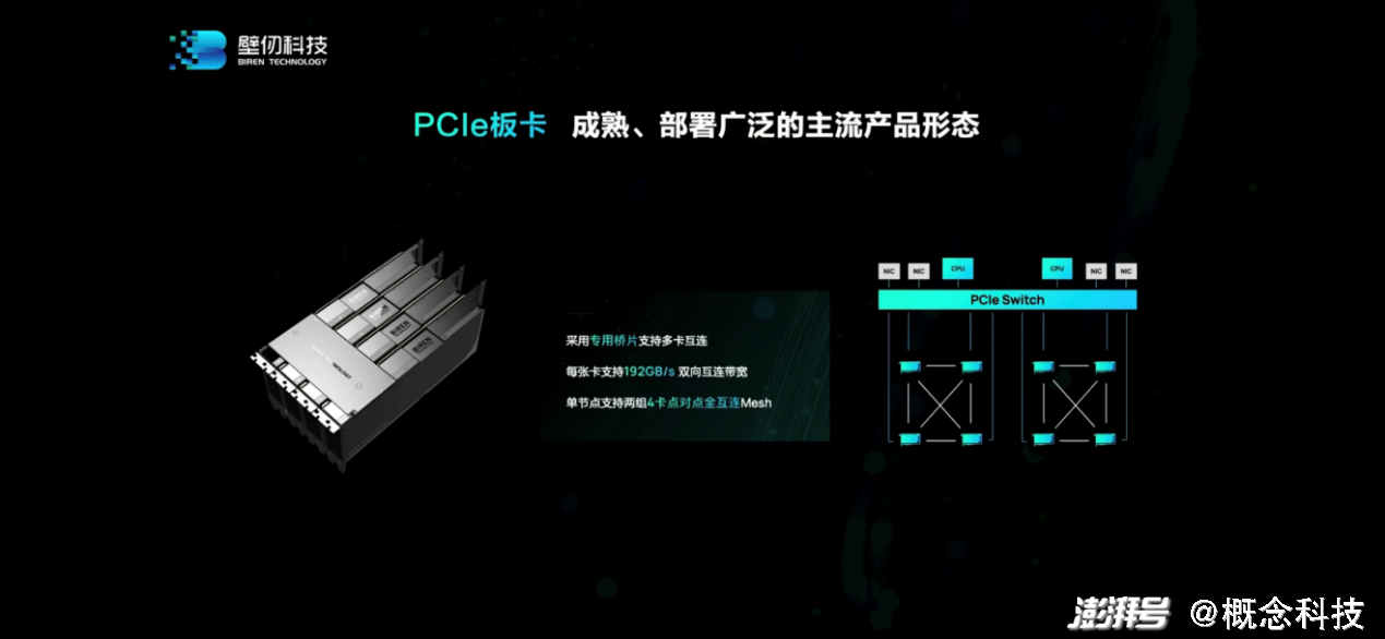PCIe板卡形态的壁砺104则能够部署在大部分2-4U的服务器里。徐凌杰特别提到,壁砺104也能够实现多卡之间的高速互连。“我们为此专门设计了高速的桥片,能够在4张卡之间形成点对点的全互连拓扑,带宽192GB/s。”