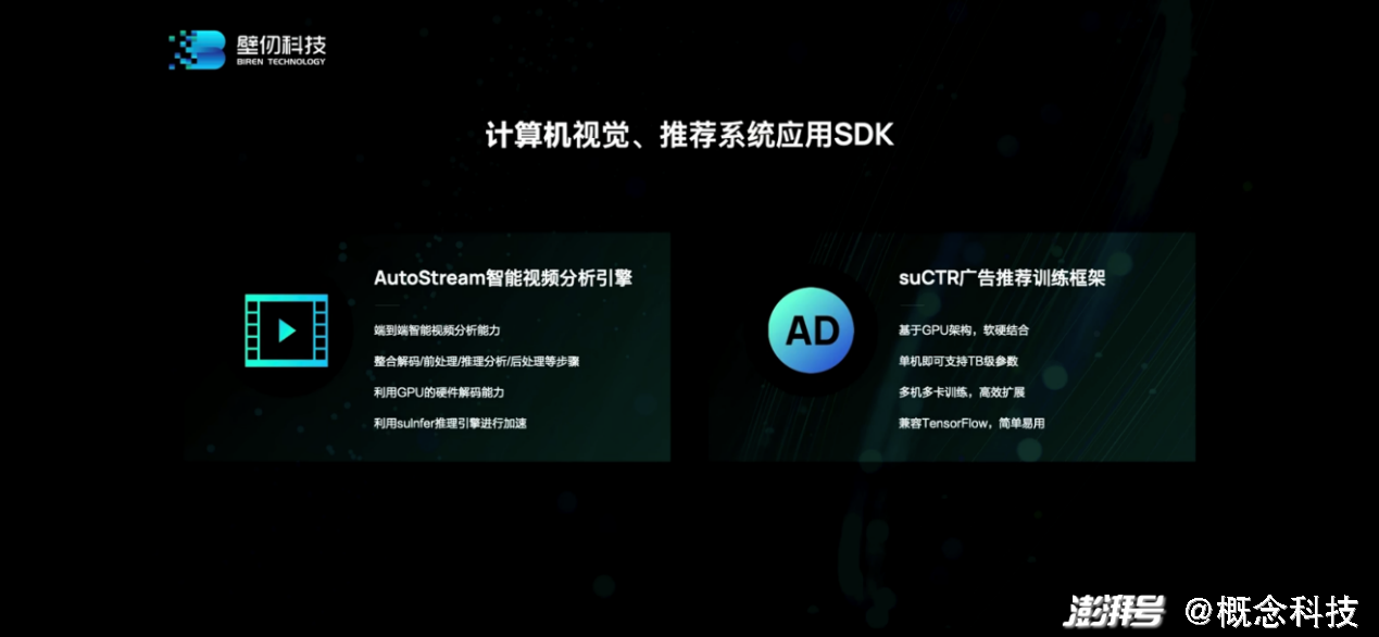 上层的解决方案,现阶段主要有两个:AutoStream和suCTR。壁仞科技联席CEO李新荣介绍说,AutoStream智能视频分析引擎是基于GStreamer框架开发的软件库,用于端到端的智能分析。“它可以对图像以及视频的数据做前端和后端的处理,充分利用壁仞GPU的解码能力和推理加速能力,高效地支持视频分析应用。”未来还会有更多AutoStream的功能问世。