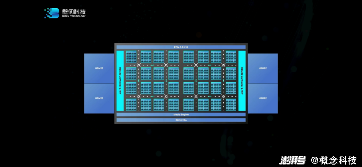 这是BR100逻辑框架图,其上包含有计算单元、2Dmesh片上网、HBM2e存储系统、媒体引擎、连接主机的PCIeGen5接口、互连接口。