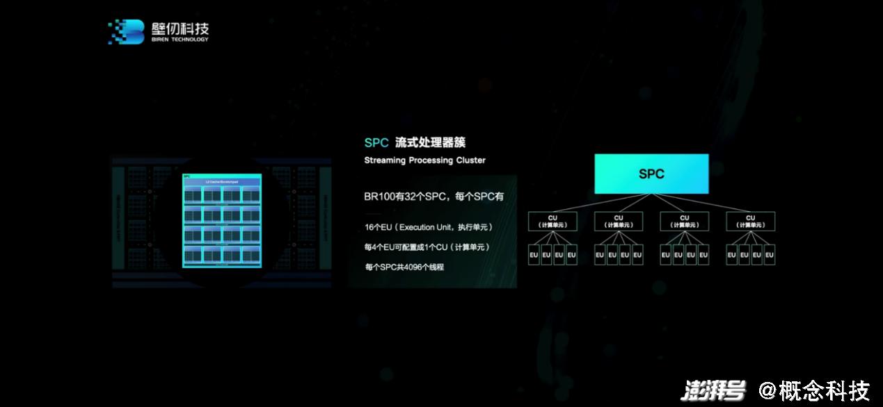 放大计算核部分,这是流处理器簇(SPC),采用标准化的模块化设计,上面能跑4096并行线程。一个SPC内部包含有16个EU(执行单元),每4个EU可配置成1个CU(计算单元)。一个BR100内部有32个这样的SPC流媒体簇。