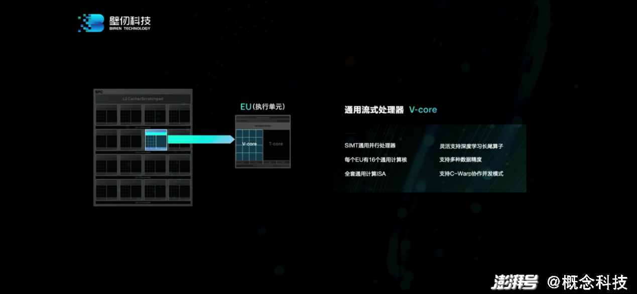 放大其中的EU。一个EU主要包含两部分,一部分是“通用流式处理器(V-core)”。“我们采用了SIMT通用并行处理器”,BR100的“通用性主要就来自这个处理器,它支持各种各样的指令,而且是完全并行的通用架构”。这部分应该也是能够兼容CUDA的原因。