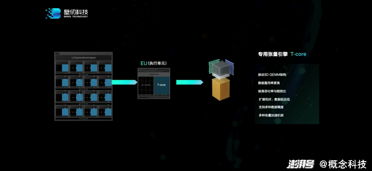 另一个部分就是tensorcore。“我们的做法和业界不大一样。我们的tensor核是完全集成在向量核里面的,作为向量核的加速器。”洪洲说,“其优点在于,可以把16个tensor核连在一起,达成更大的tensor核,让矩阵运算效率得到极大提高。我们算下来大概能提高30%。”