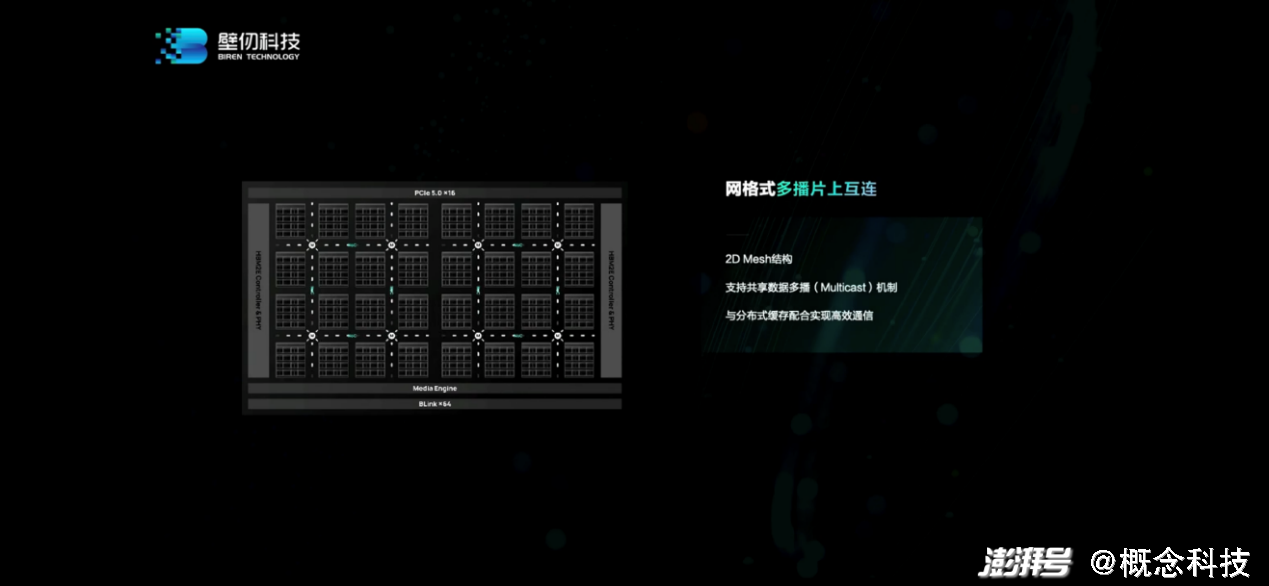 BR100所用的片上网络(NoC),为“网格式多播(multicast)片上互连”。“权重一般来说是可以共享多播的;当你跑模型并行,trainingsample也可以共享多播。这样就能极大减少对内存的带宽压力,减少片上网link的带宽压力。”