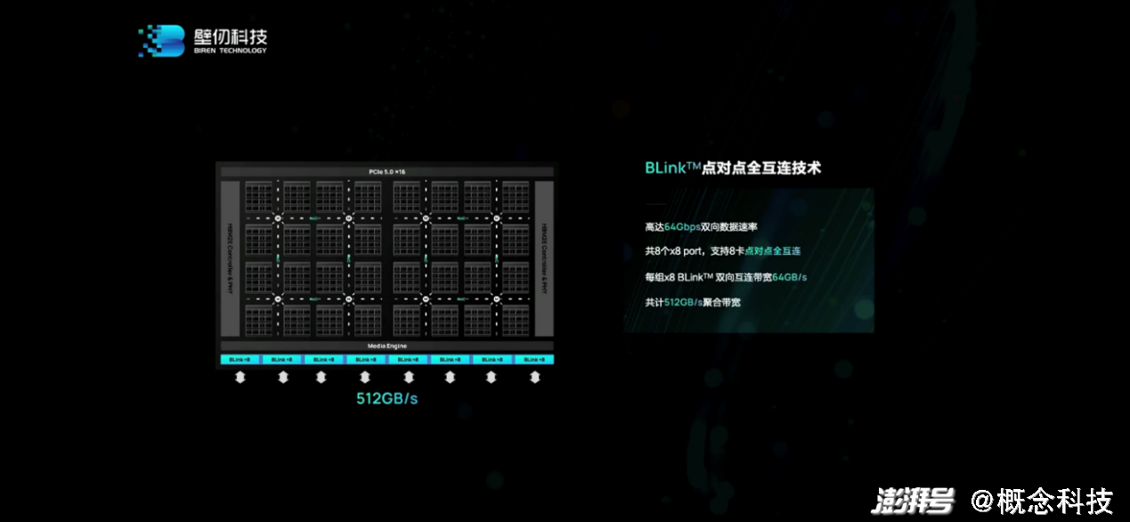 IO方面值得一提的特性,除了PCIeGen5主机接口支持——128GB/s带宽,并且支持CXL互连协议以外;BLink点对点全互连技术,在壁仞科技的版图中应该也是很重要的——可类比于英伟达的NVLink。