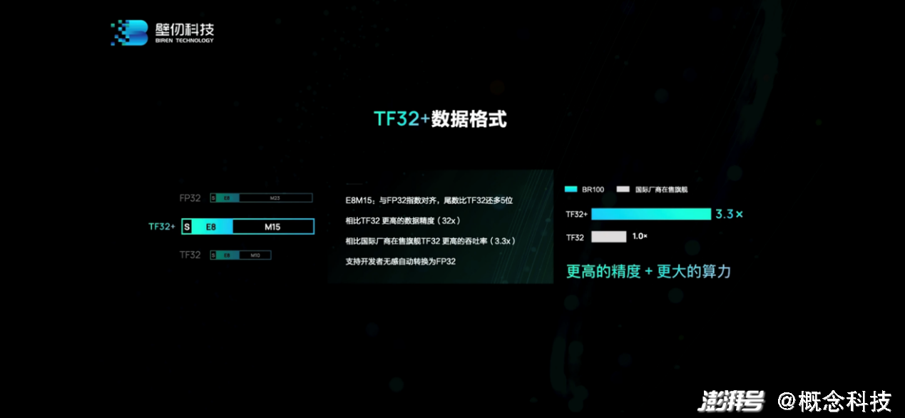 “我们的TF32+,精度bit有15bit(E8M15),TF32就只有10bit。我们增加了5bit,相当于增加了32倍精度。”洪洲说,“即使这样,我们的TF32+算力仍然是头部厂家TF32的3.3倍。”所以最终达成了“更高的精度”和“更大的算力”。
