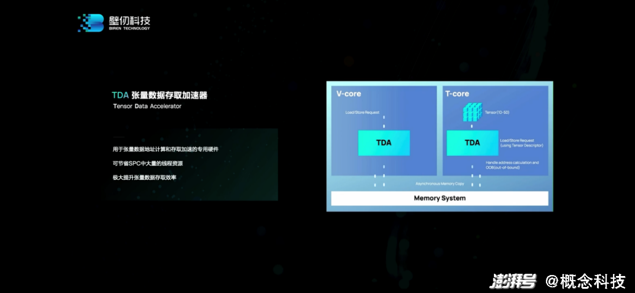 架构层面的另一个亮点在于TDA(TensorDataAccelerator)张量数据存取加速器。这个加速器用于offload计算单元(SPC)的数据存取工作。“它是个专门的加速器,像数据的加压、解压、地址计算、同步。它能让计算和数据搬动做到异步。”