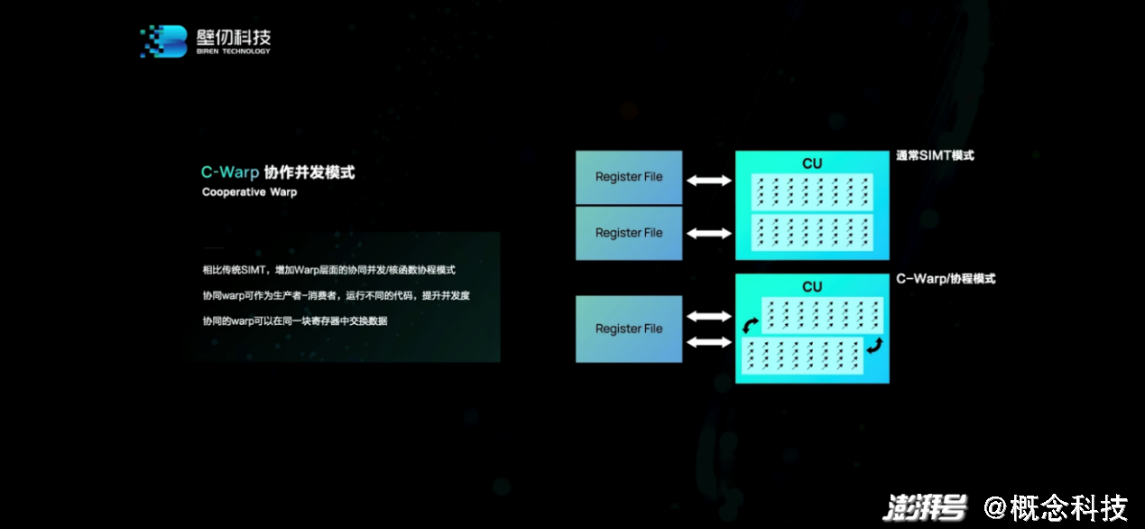 比如C-Warp协作并发相比于传统GPU的warp和warp之间不能直接通讯(需要经由cache来交换数据),“我们这种模式可以藉由一些同步方式,通过RegisterFile来直接传递数据,也就减少了数据的搬移。”