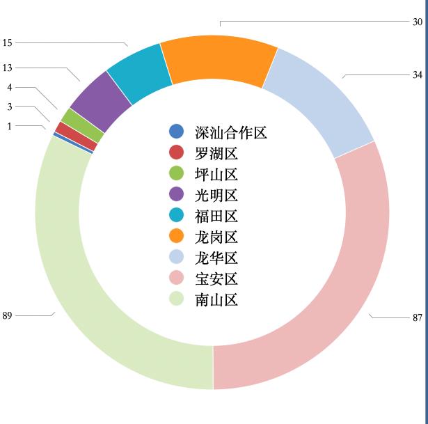 从深圳各区来看,第一梯队是南山区与宝安区,各有89家与87家,第二梯队为龙华、龙岗两区,分别为34、30家。福田、光明两区分别为15、13家,坪山、罗湖及深汕特别合作区屈指可数,分别为4、3、1家,大鹏新区没有。