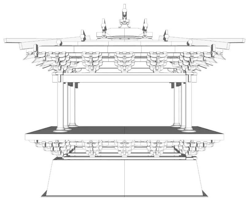 剖面设计上的另外一个难题是确定平坐加墩台的总高。《营造法式》中并无现成的尺度参照,考虑到古代匠人在设计房子的时候,并不会使用太复杂的比例关系,而是倾向于使用一些简明的参照来确定构建的尺寸。故尝试用檐柱高度作为一个扩大模数,使平坐和墩台的总高与檐柱高度相等,以此得出复原结果(图14,图15)。