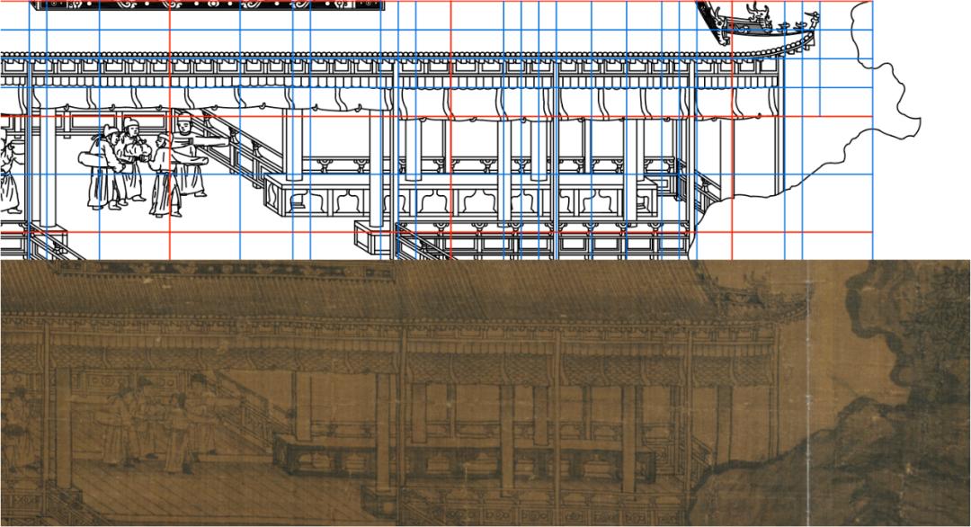 图32 《明皇避暑宫图》使用的水平参考线关于网格在《明皇避暑宫图》中的运用,上文提到的水榭最具有代表性。