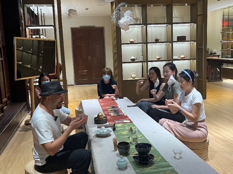 团队探访“非遗”的第一站是豫园华宝楼。著名茶人戎新宇与中外学生围坐茶案,以中国传统茶文化为切入点,用通俗易懂的语言讲述了茶之起源、制茶法的演变、饮茶方式的发展与变迁,并展示了宋代时期的茶百戏与点茶。