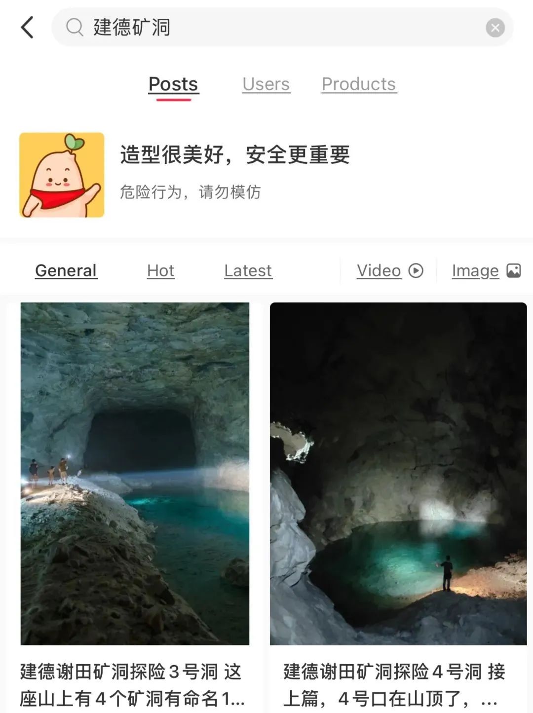 在平台上以“矿洞探险”为关键词进行搜索发现,系统虽然提示“危险行为,请勿模仿”,但仍有不少关于矿洞探险的图文,还有走进矿洞里拍照“凹造型”的画面。