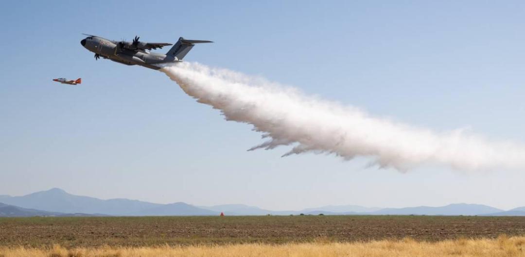 A400M进行灭火剂投放演示。7月26日,在西班牙的一次飞行测试中,由空客公司研发的A400M运输机对其消防灭火套件的工作能力进行了实际飞行展示。