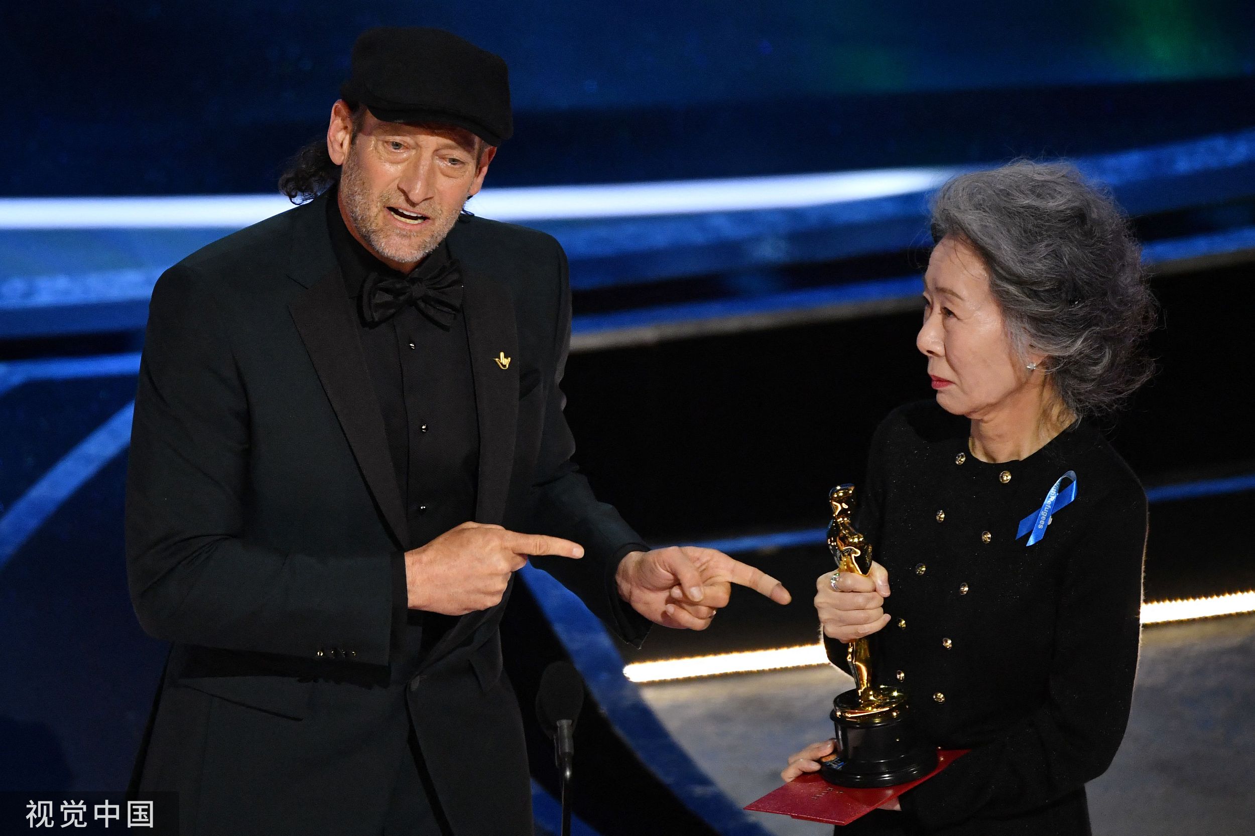 当地时间2022年3月27日,尹汝真将奥斯卡最佳男配角奖颁给出演《健听女孩》的听障人士特洛伊·科特苏尔,并用手语告诉他获奖。人民视觉 图