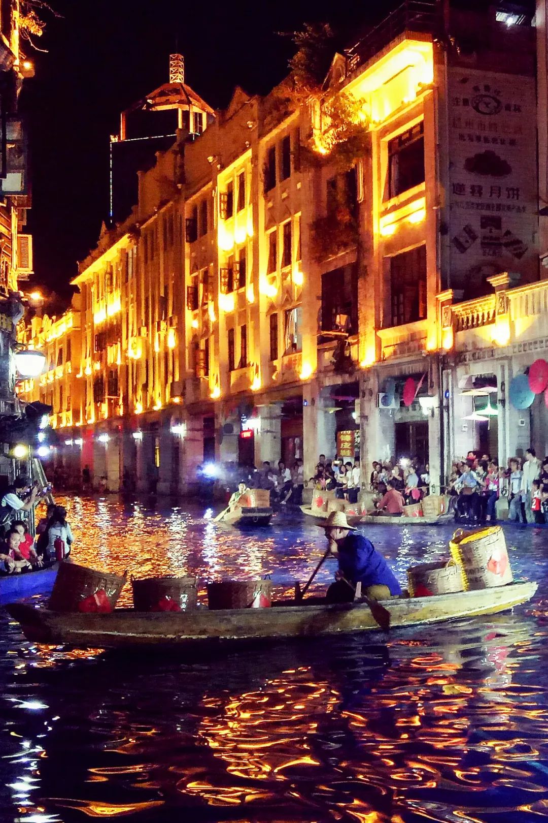 现代梧州人在模拟旧时发洪水时城中行舟的情景。