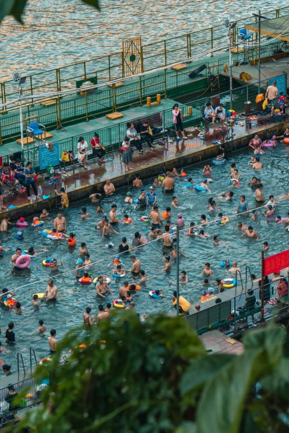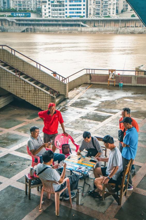 图1:洪峰下悠然打牌的梧州人;图2: 梧州游泳场。