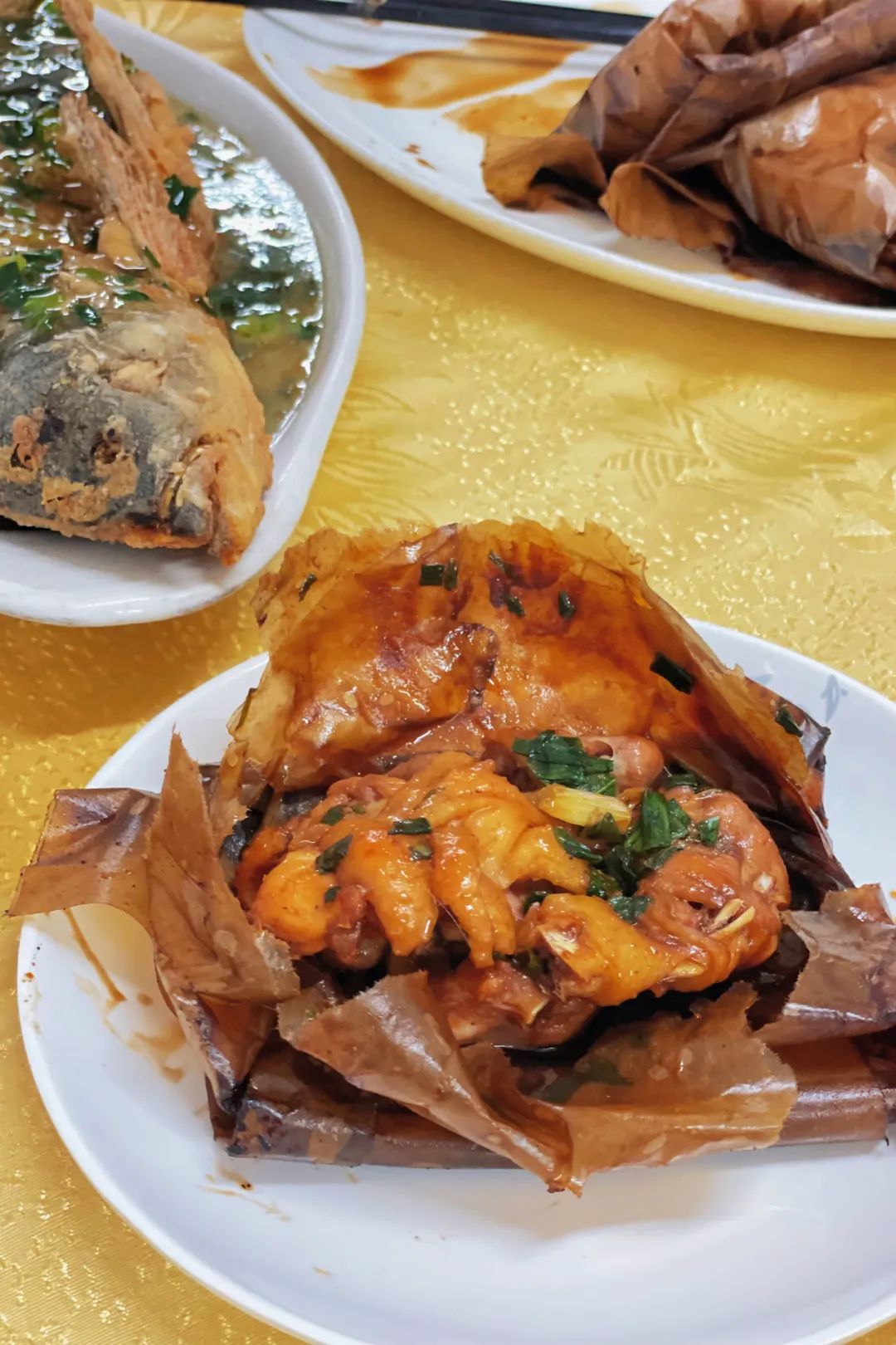 粤友餐厅纸包鸡、葱油鱼。在梧州,纸包鸡是用岑溪古典鸡制作(岑溪是梧州下辖的县),