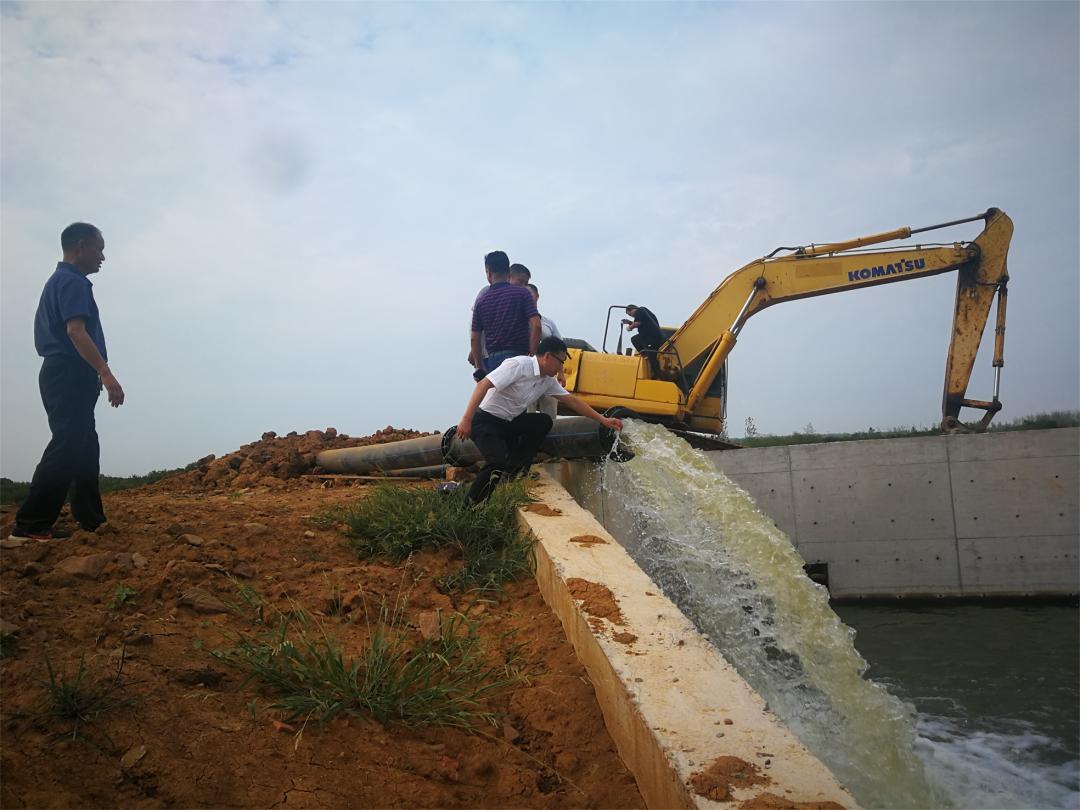 (架设的官亭电灌站南站第三台临时水泵出水)县水务局决定架设临时泵站,抗旱队员们连续奋战了2天2夜,分别架设了三台提水扬程14米、泵管长276米、总功率137千瓦的临时泵站,三台临时泵站每天可抽送抗旱用水约4.8万立方米,有效缓解农田旱情。