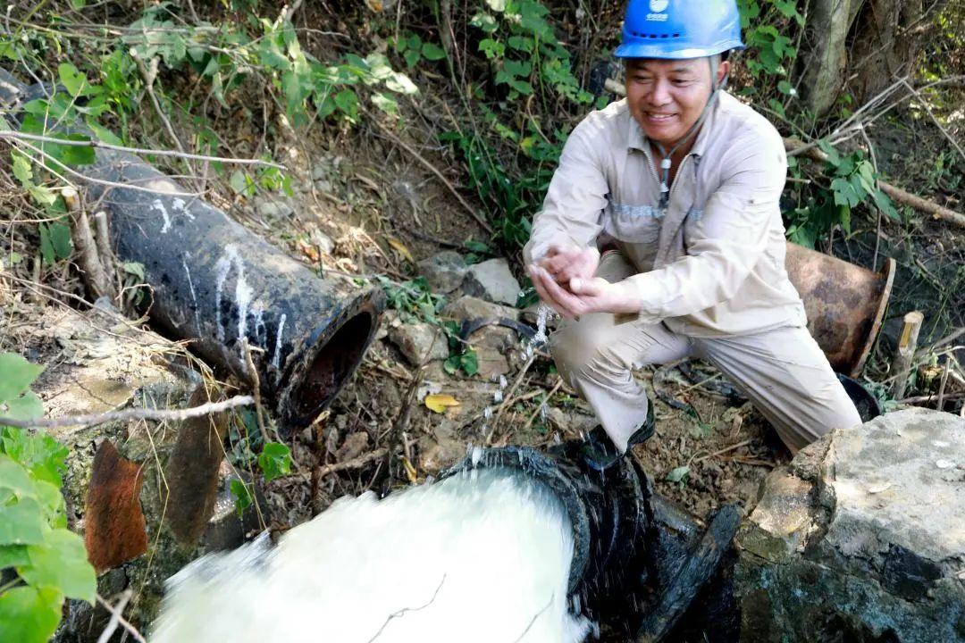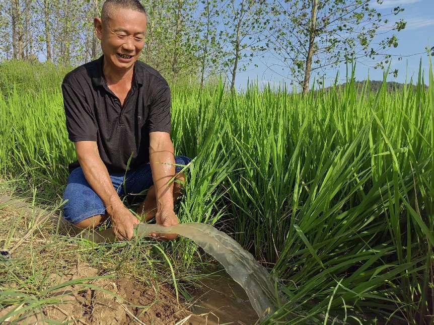 (灌溉入田,村民笑开颜—马静文供图)张老圩村组织干部群众沿高切岭铺设水管,清理枯木杂草、淤泥堆积,通过高切岭断头渠引潜南干渠灌溉水,从潜南干渠到张老圩村水域,共1400米长,铺设了近30根水管,顺利将水源引入张老圩村各旱田。