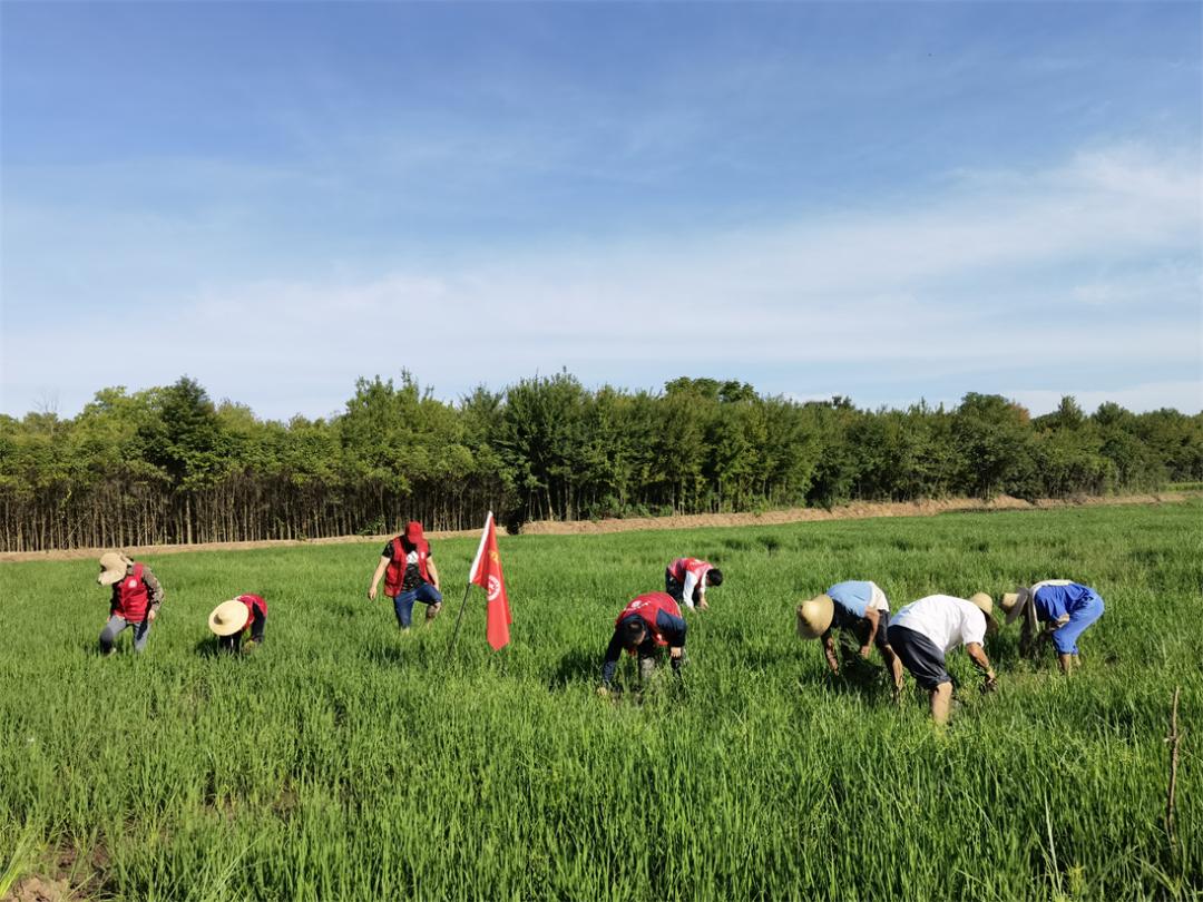 (李陵村干群除草除杂—张磊供图)李陵村两委对辖区生长期缺水秧苗进行灌溉,疏浚水渠,为10余户群众缓解稻田灌溉缺水问题,覆盖水稻种植面积20余亩,并带领志愿者开展义务除草除杂活动,全力保障粮食稳产保收。