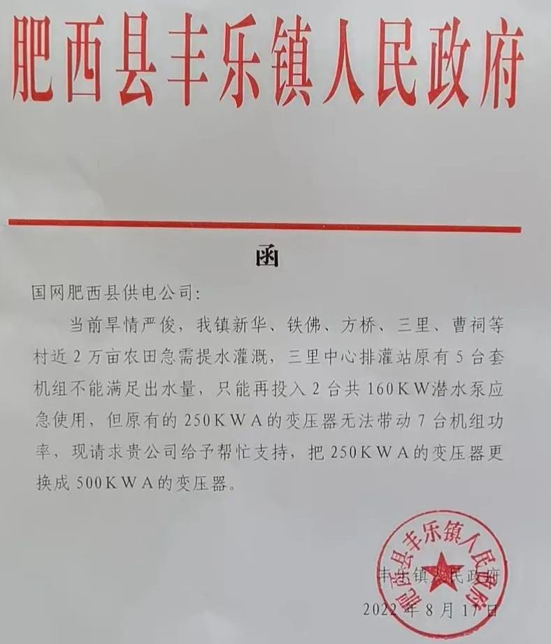 近日,肥西县高温晴热天气持续,恰逢水稻结穗时期,抗旱保苗迫在眉睫。为了给镇内近2万亩农田“解渴”,丰乐镇在三里中心排灌站原有的5台机组基础上,又新增了2台160千瓦的潜水泵。泵是装好了,一个难题又浮现出来:原来的250千瓦变压器功率不够,拖不动这7台机组。8月17日,丰乐镇人民政府向国网肥西县供电公司致函,请求将原有变压器更换为500千瓦容量的变压器。