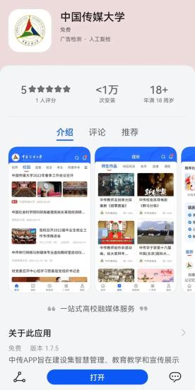 1. 安卓(Android)、鸿蒙(HarmonyOS)等系统手机在应用商店搜索“中国传媒大学”,苹果(iOS)系统手机在AppStore搜索“中国传媒大学客户端”,点击下载安装。